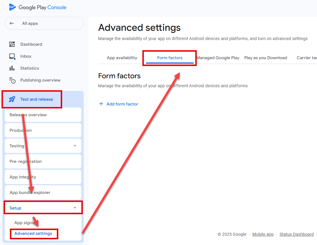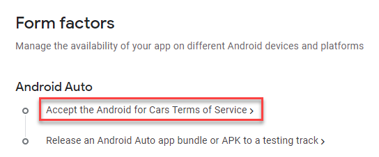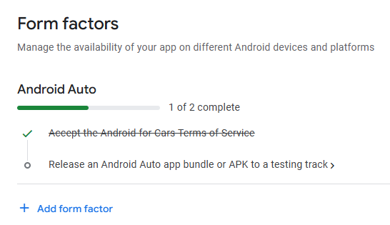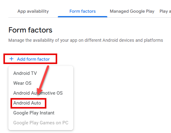5. Click on + Add form factor and select Android Auto from the drop-down menu.