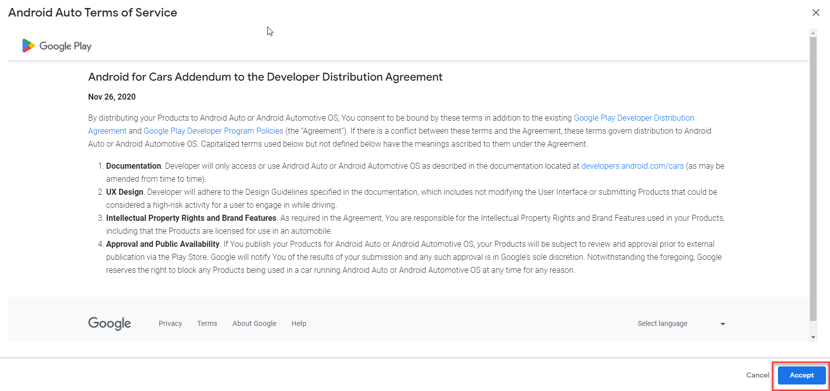 6. Click on Accept the Android for Cars Terms of Service.
