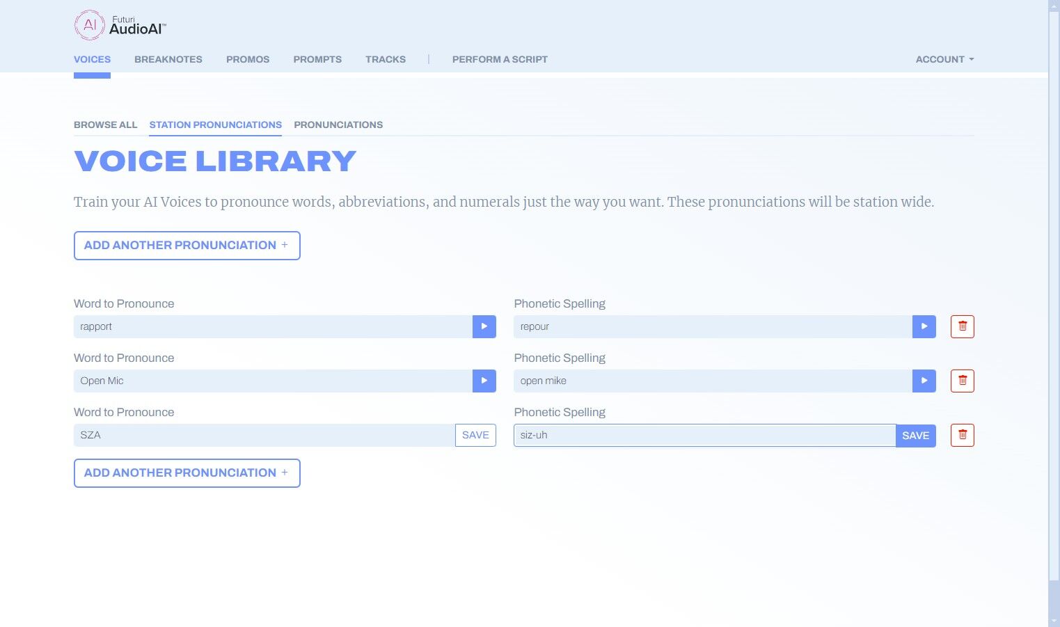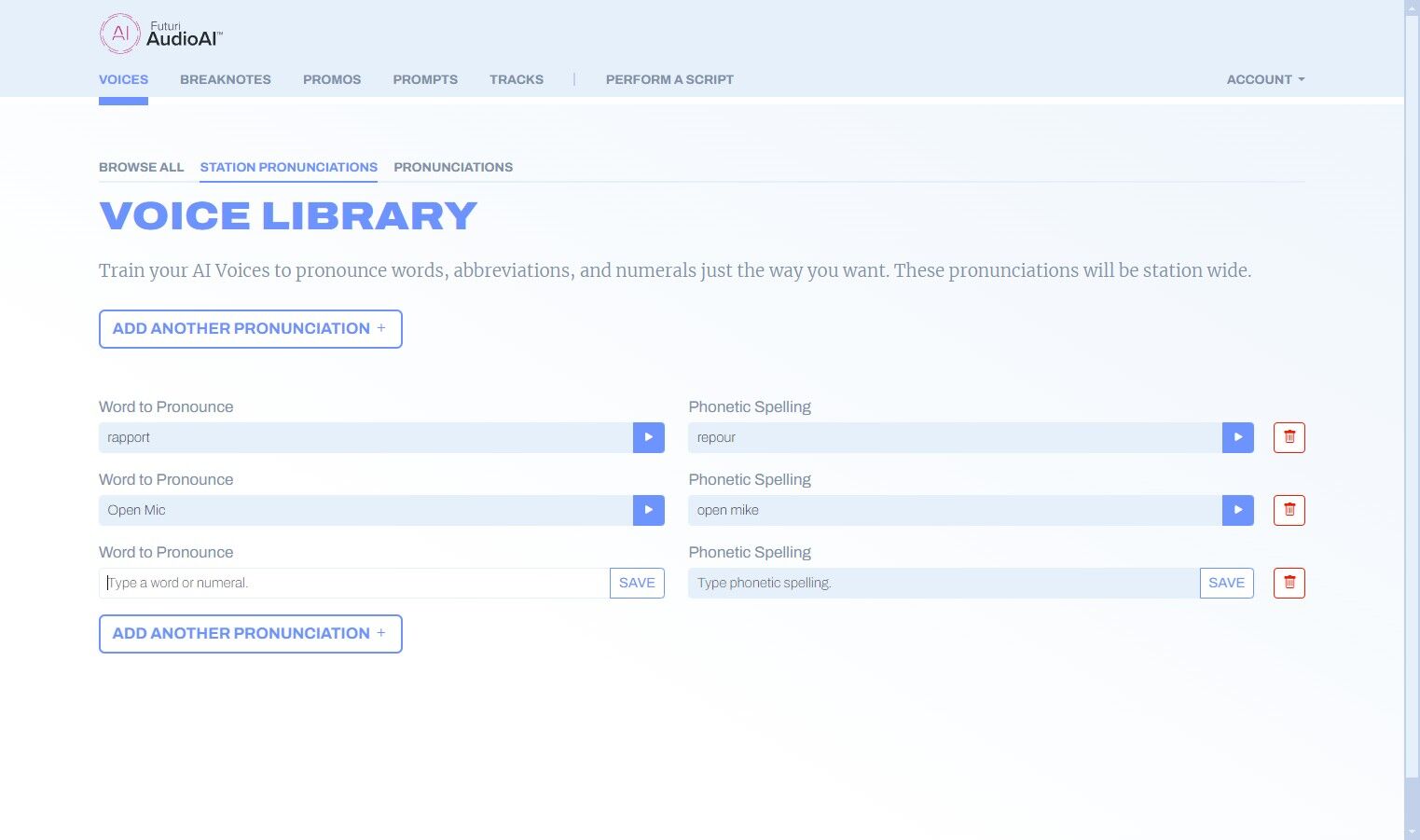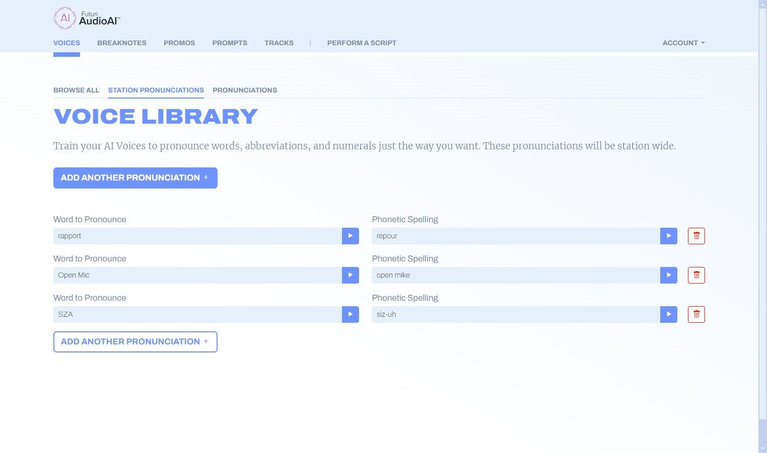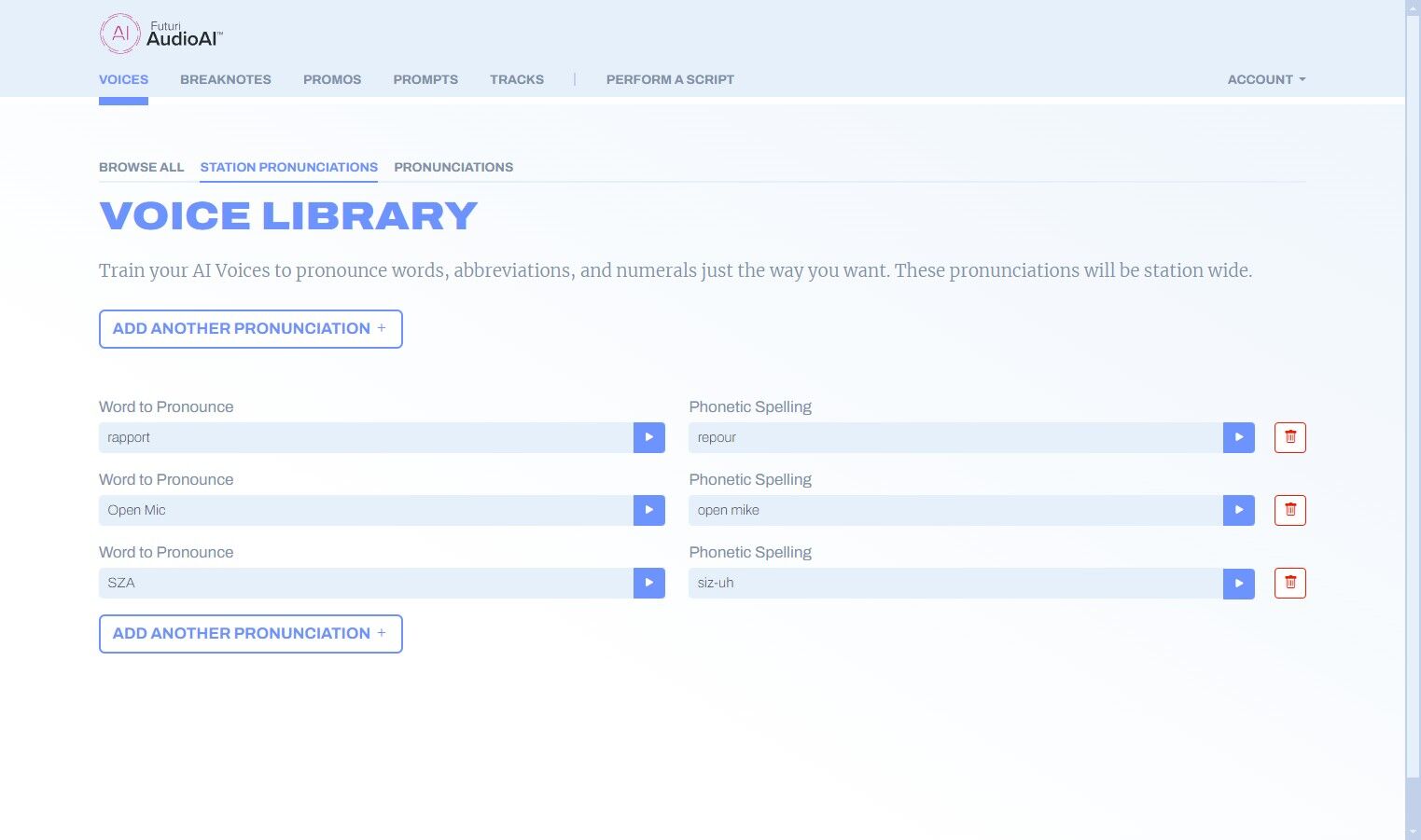 Use STATION PRONUNCIATIONS when you want to apply a pronunciation to all voices on your account.
