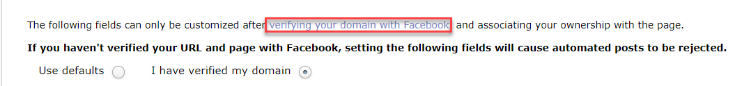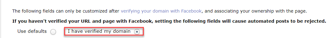 NOTE: If you indicated that you have verified your domain without completing the required steps with Facebook, it will cause your posts to be rejected by Facebook. - Lastly, customize your default link caption, title, and image.