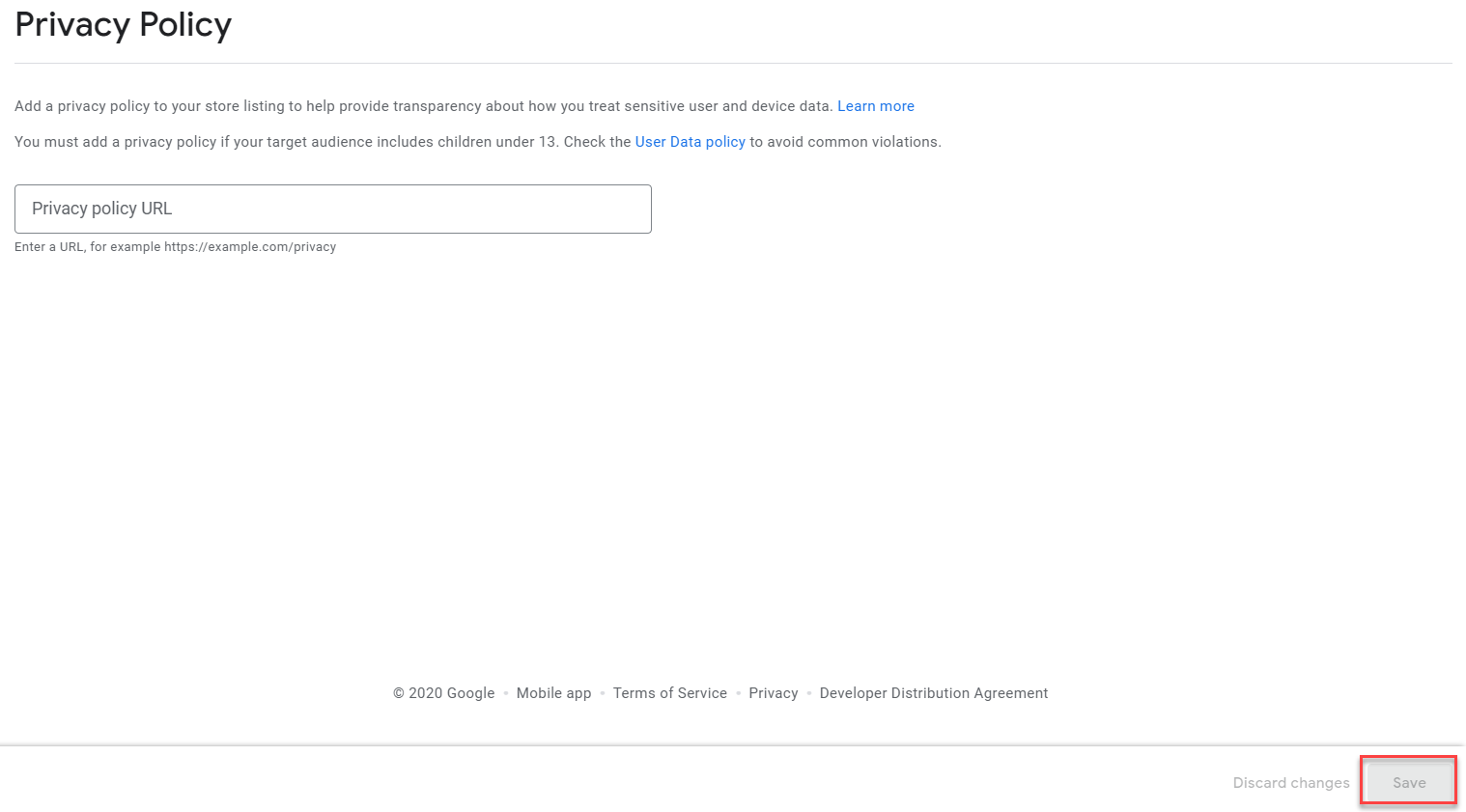 - You must have entered a link to your Privacy policy already in order to save. If you have not done so, you will see this message. Make sure to save the Data safety survey as a draft before going to the Privacy policy page to enter your URL. Once entered, return to the this survey to complete it.