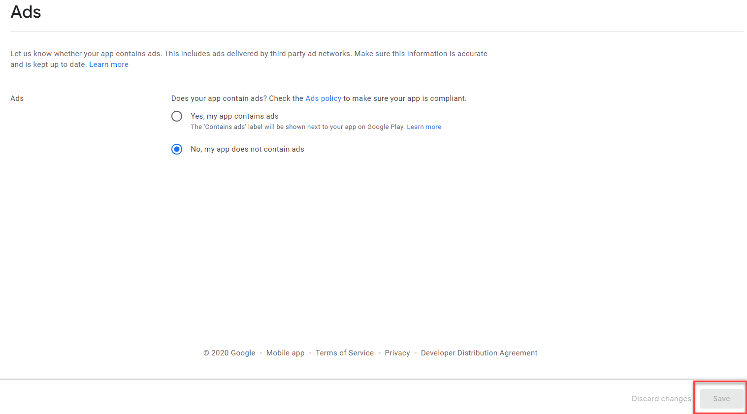 - You can review Google's ad policy by clicking the link provided. If your app contains ads, select Yes. Otherwise, select No.
