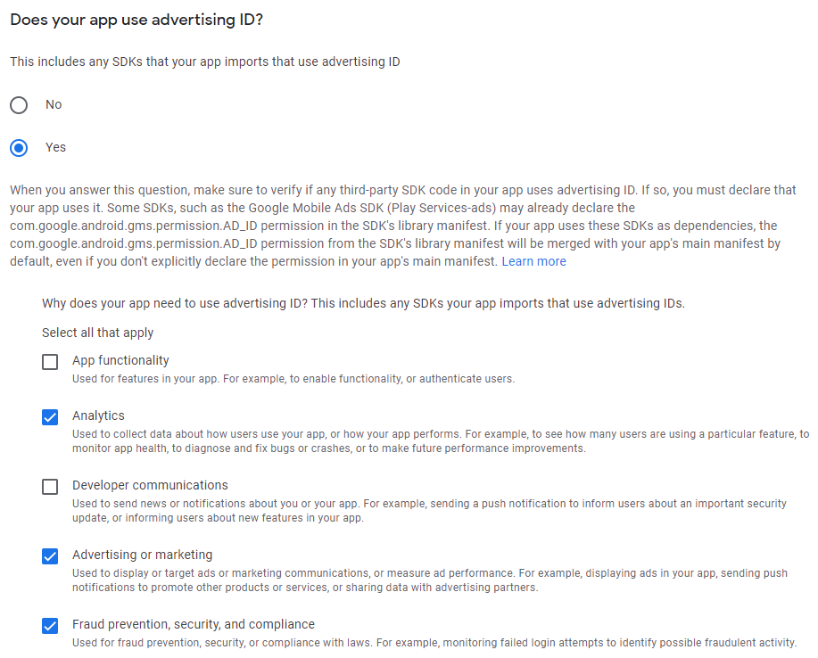 NOTE: If either one or both of the first two options is selected, you will be required to submit proof that your app meets Google's requirements.