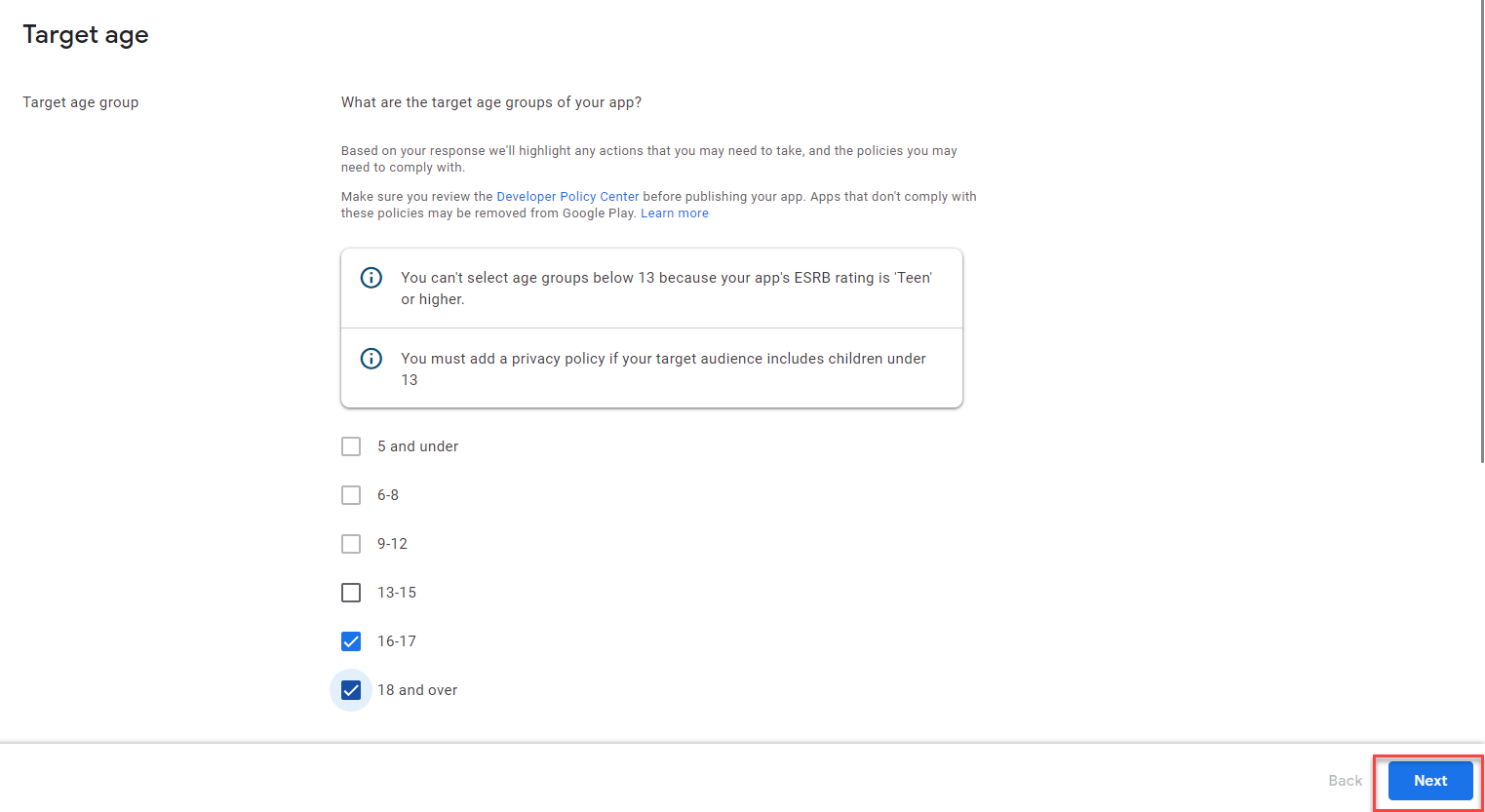 - Indicate the age ranges that your app/station targets. Based on the Content Ratings you selected, Google will indicate any date ranges for which your app is uneligible. Then, click Next to proceed.