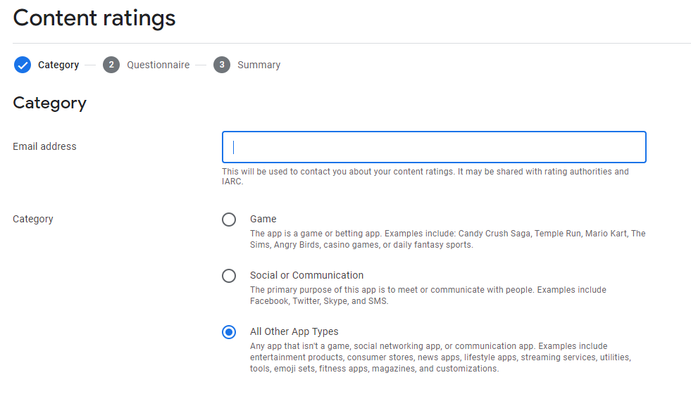 - Answer each of the questions in the next section related to the type of content in your app. Make sure to consider all content, such as song titles that might include crude language or references to alcohol. Also, Google may consider any in-app contests as gambling.