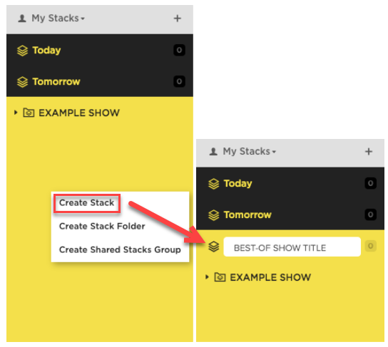 1. Right-click in the yellow area under MY STACKS and select to CREATE STACK. Title the new stack with a name that reflects this is "Best Of" content.