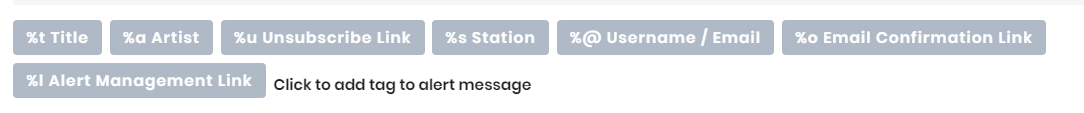 The following replacement variables can be used when filling out Song Alert templates in the LDR Dashboard. The variables described here will automatically be replaced with the appropriate value when an alert is sent. For ease of use, you will see handy buttons that will automatically insert the selected tag.