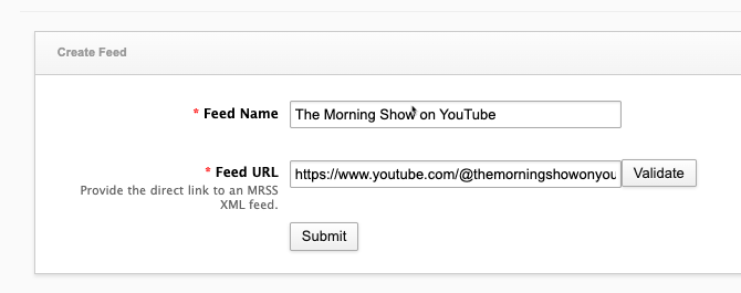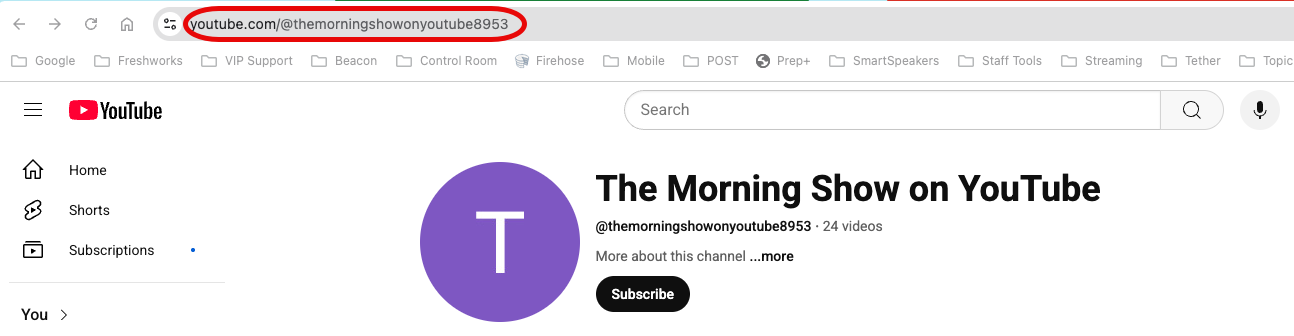 - For example, change this: https://www.youtube.com/@themorningshowonyoutube8953/ to this: https://www.youtube.com/@themorningshowonyoutube8953/feed