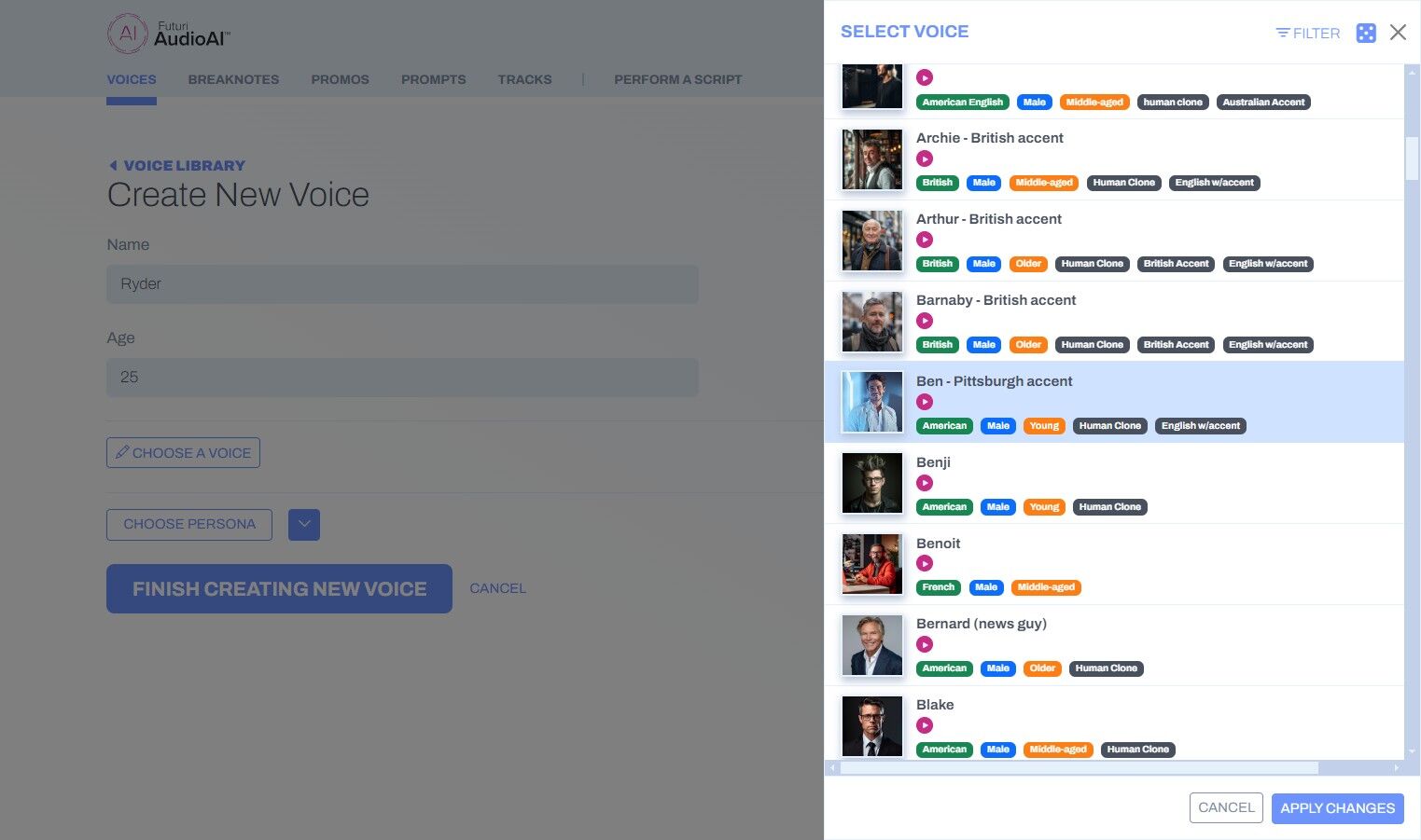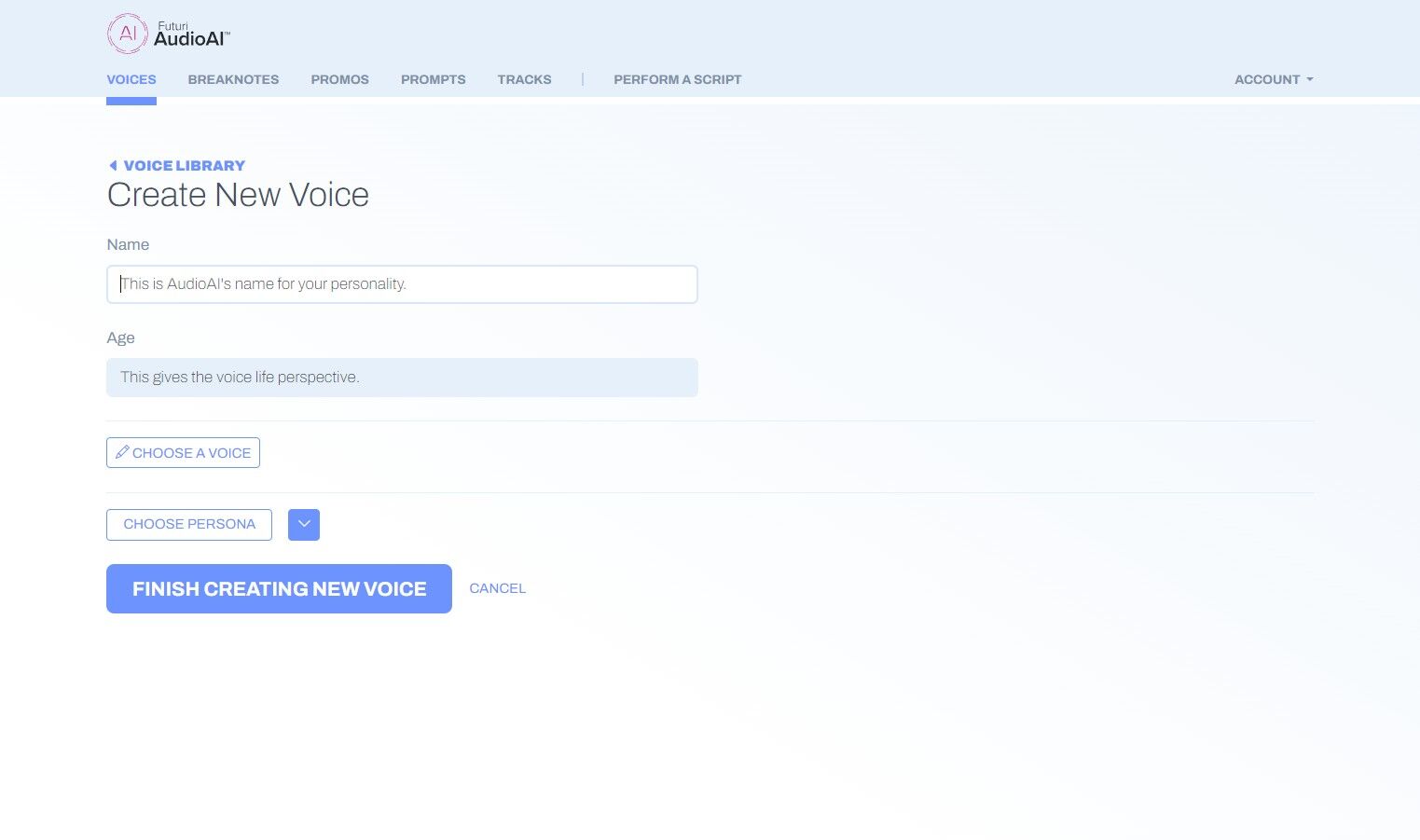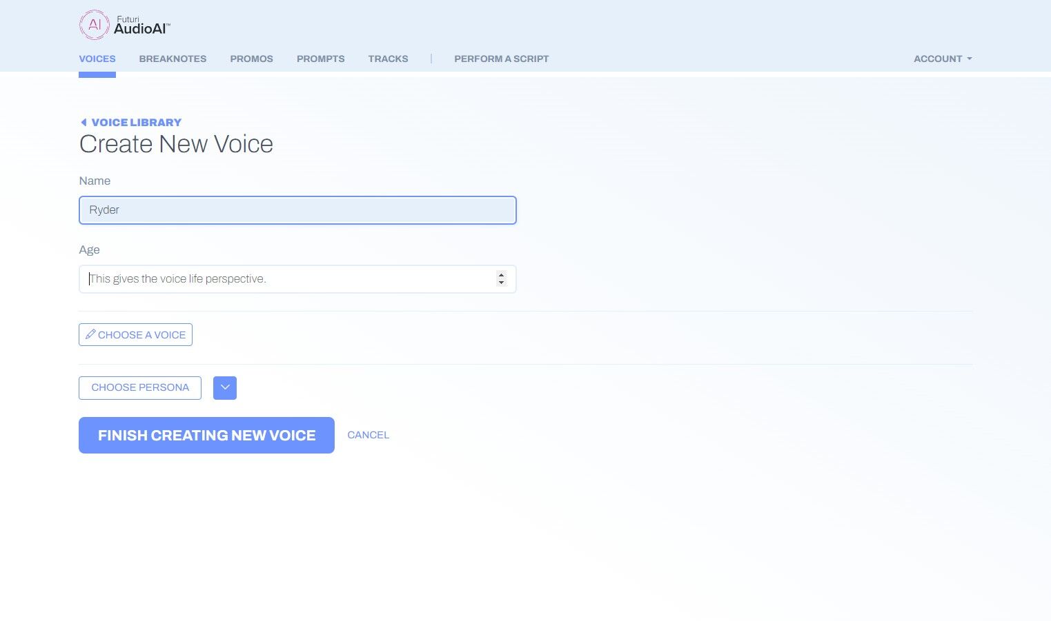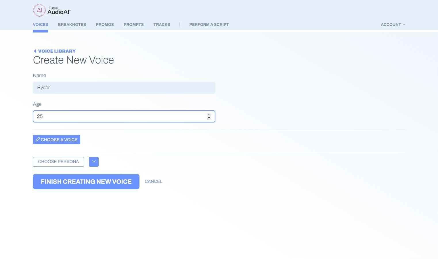9. After you have made all your selections, Click FINISH CREATING NEW VOICE. Your new voice will now be available to any user on your account and can be edited as needed in the future.