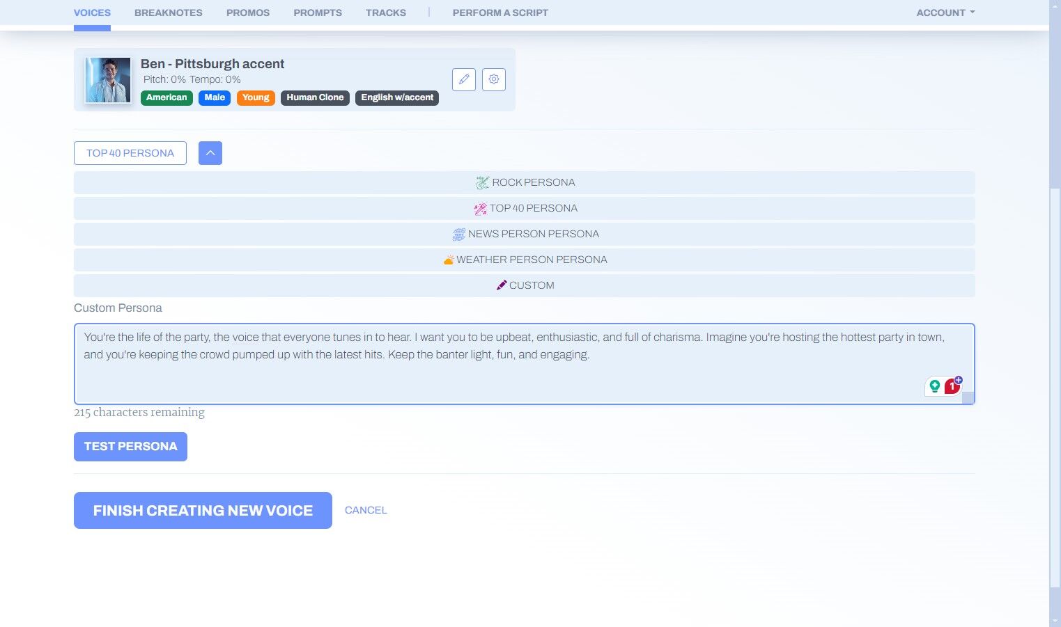 8. Optionally, you can select a Persona for your voice that will influence how artful content is written.