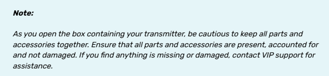 Note: As you open the box containing your transmitter, be cautious to keep all parts and accessories together. Ensure that all parts and accessories are present, accounted for and not damaged. If you find anything is missing or damaged, contact VIP support for assistance.