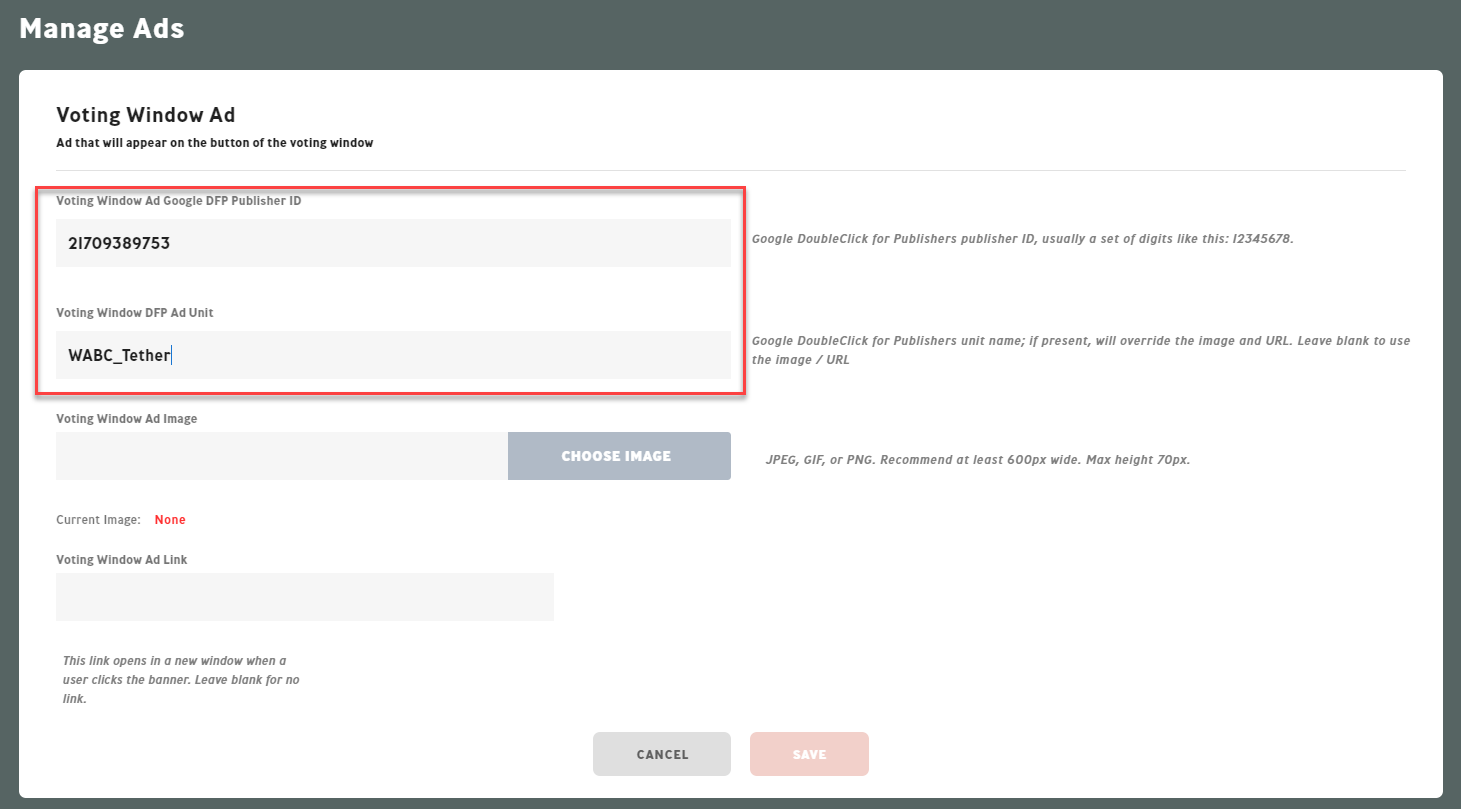 Interstitial Banner Ad WABC_tether_banner 320x50  (unless your voting window is embedded at a wider width, in which case you'll choose dimensions that fit the width where you've embedded your voting window)