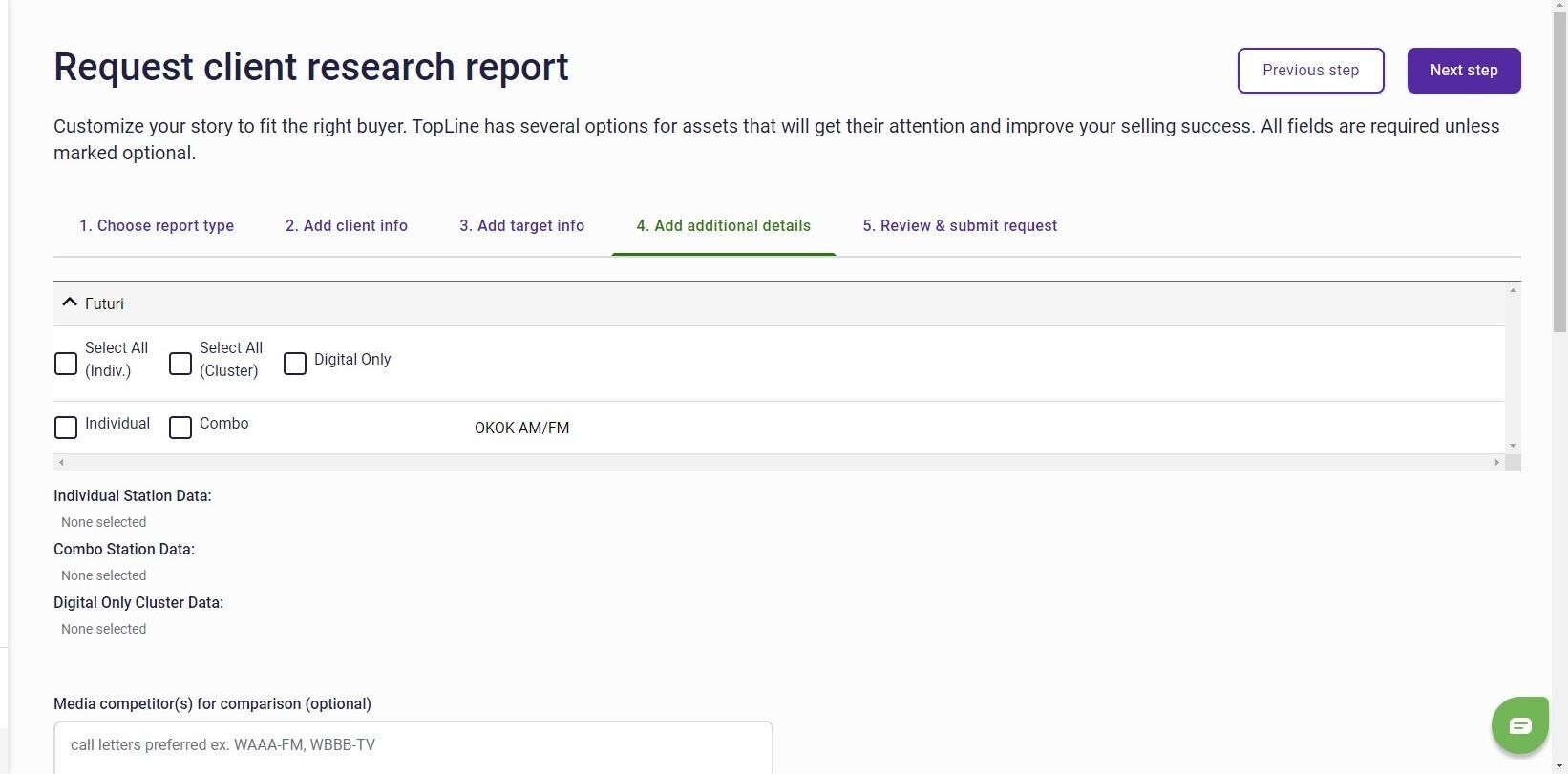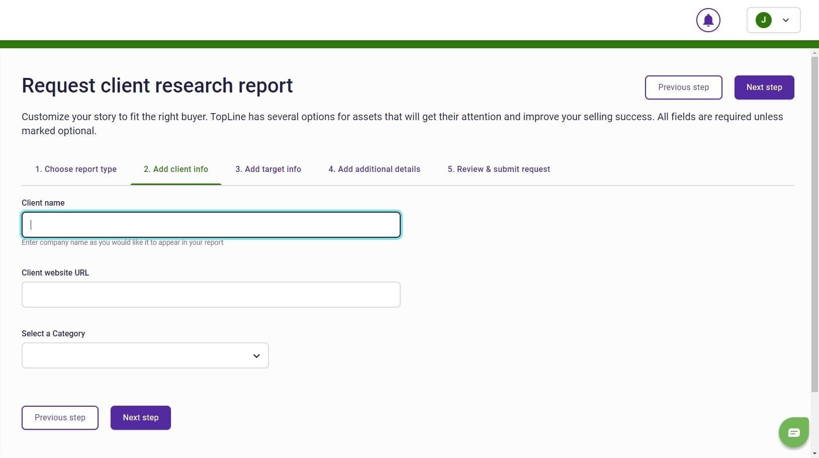 8. After clicking the Next Step button, you will add client info like their name, website, category, demo, etc., which will help us fine-tune the research for you.