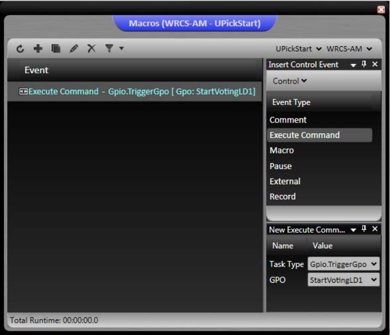 Select Macro from the Zetta Configuration menu. Select the correct station and click the Add button. Give the Macro the same name as the GPO event. Select Execute Command from the Insert Control Event consideration window (on the right). In the New Execute Properties window, select a Task Type of Gpio.TriggerGPO and the matching GPO event previously created. Drag and drop the Execute Command from the Insert Control Event consideration window on the right to the Event pane on the left. Repeat adding a Macro for each GPO event.