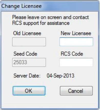Contact RCS Support with the Seed Code. RCS Support will provide a valid Licensee, the RCS Code, the Username and the Password needed for licensing the application. Enter the Licensee and RCS Code; click OK to update the License tab. Enter the Username and Password received from RCS Support, then click Get License. Optionally, select Remember Credentials to have the application retain the Username and Password.