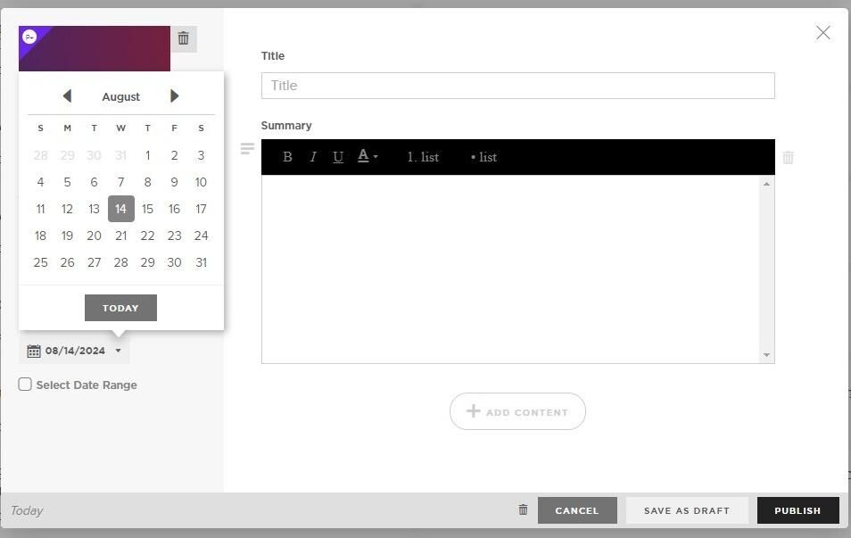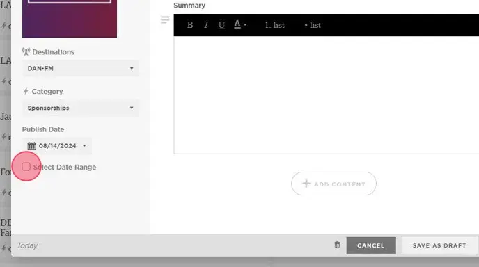 9. Optionally, check the box to Select Date Range and set an end date, or choose NEVER for evergreen content.