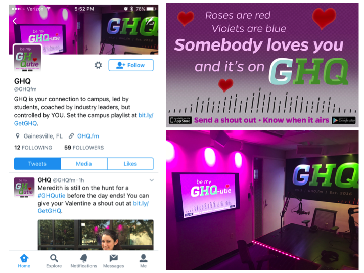 GHQ, the student station at the University of Florida, used their Futuri Mobile app's Open Mic feature for a Valentine's promotion they called "GHQutie," where users sent each other Valentine's shout-outs with Open Mic, and GHQ played them back on the air. The station also heavily pushed the ability for users to be alerted when their GHQutie shout-out was about to play, driving tune-ins back to the radio station!