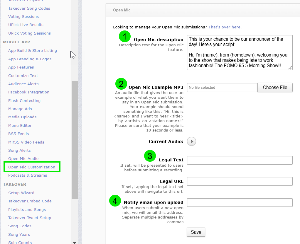 - Open Mic Example mp3: Upload an audio file to showcase an example of what you want your listeners to say in their Open Mic submissions. Your example could sound something like this: "Hi, this is _______, and I want to hear..."