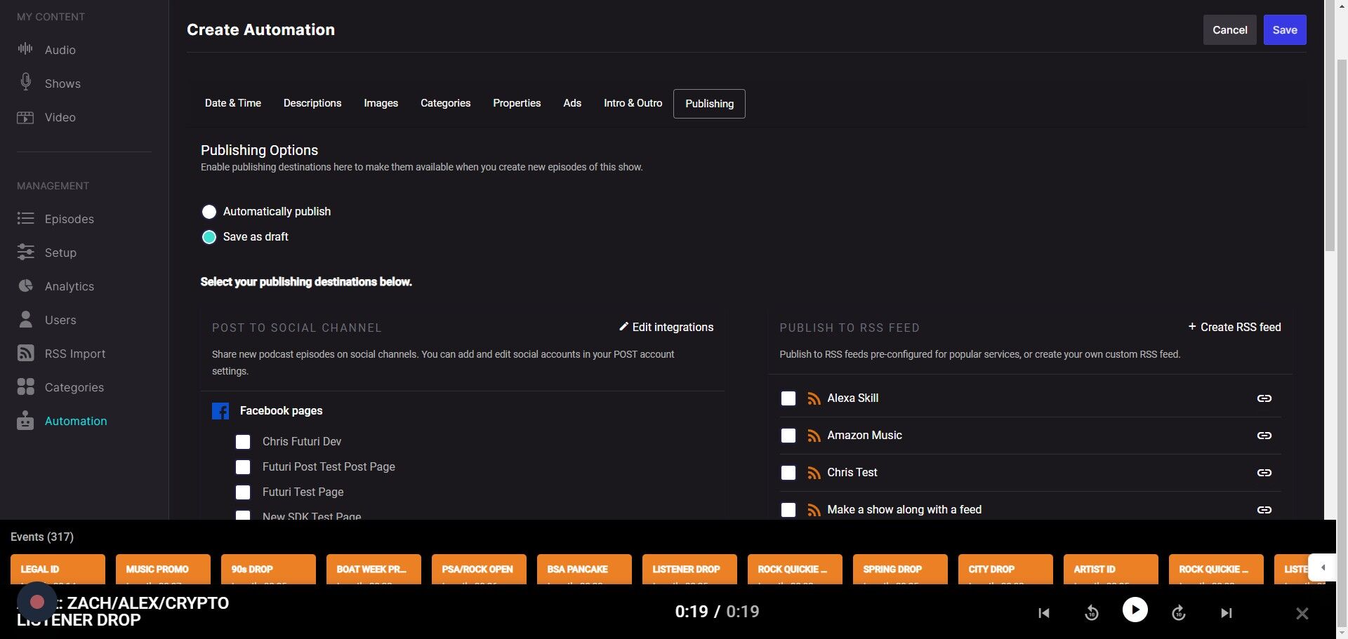 POST Automatic Publishing is the set-it-and-forget-it solution for episode publishing. Follow the directions below to create your automation, and let POST do all the heavy lifting for you. You can automatically publish your episodes without lifting a finger, or save them as drafts for your review before releasing at a time you choose.