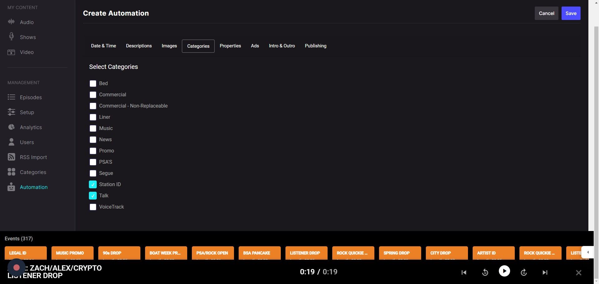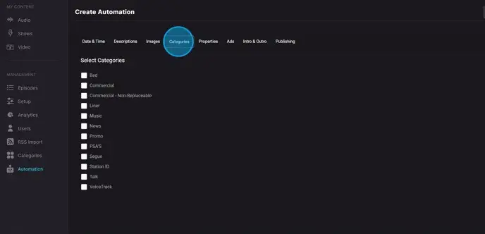 8. In the Categories section, choose the audio segment categories to publish from your previously selected time period.