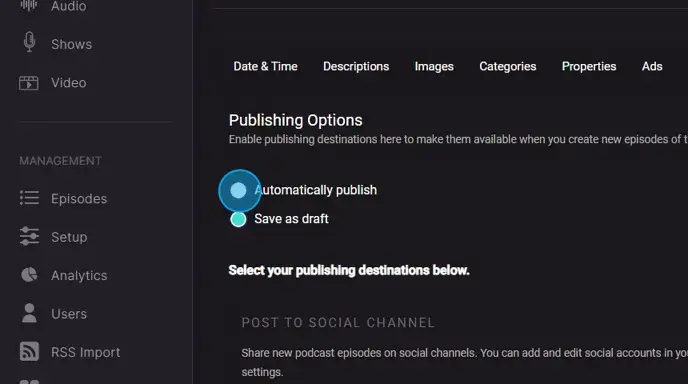 13. Under Publishing Options, choose whether to automatically publish your episode(s) when ready or save the file as a draft to be manually published at a time of your choosing.