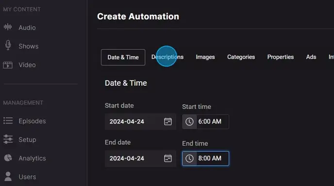 5. On the Descriptions tab, update the Episode Name and Description. Optionally, you can use day and date variables to automatically label your episodes when they are published.