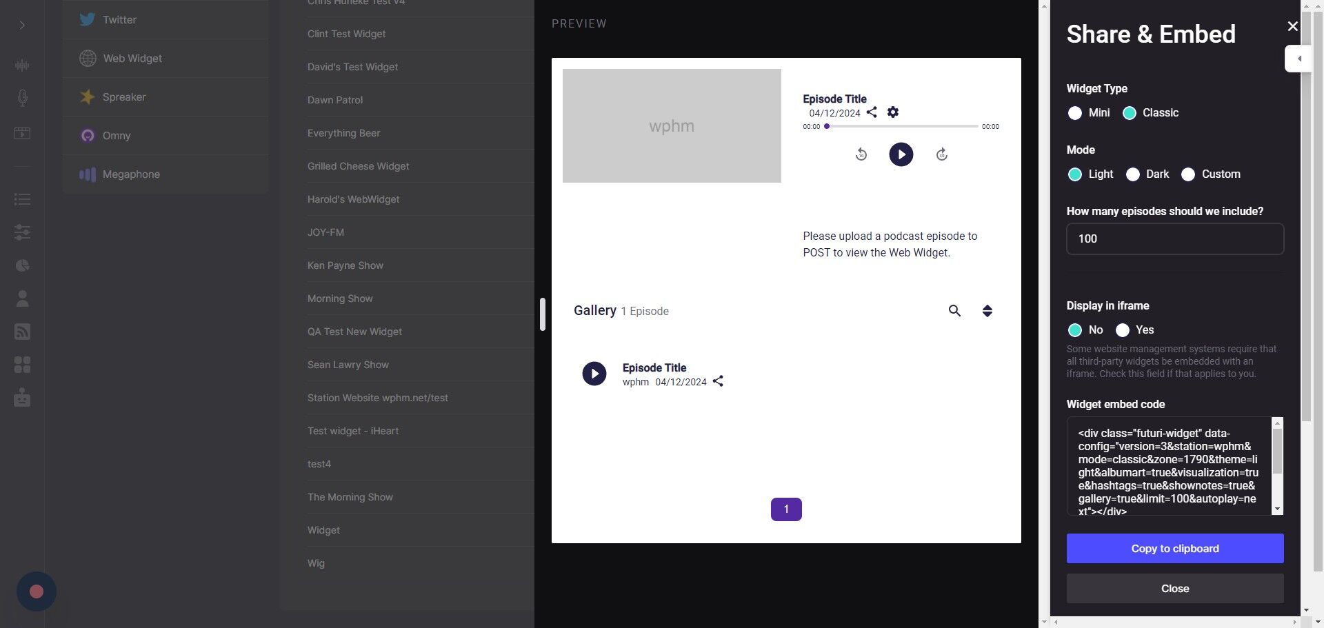 10. When you have made all your selections, click Copy to clipboard to obtain your widget code for use on your website.