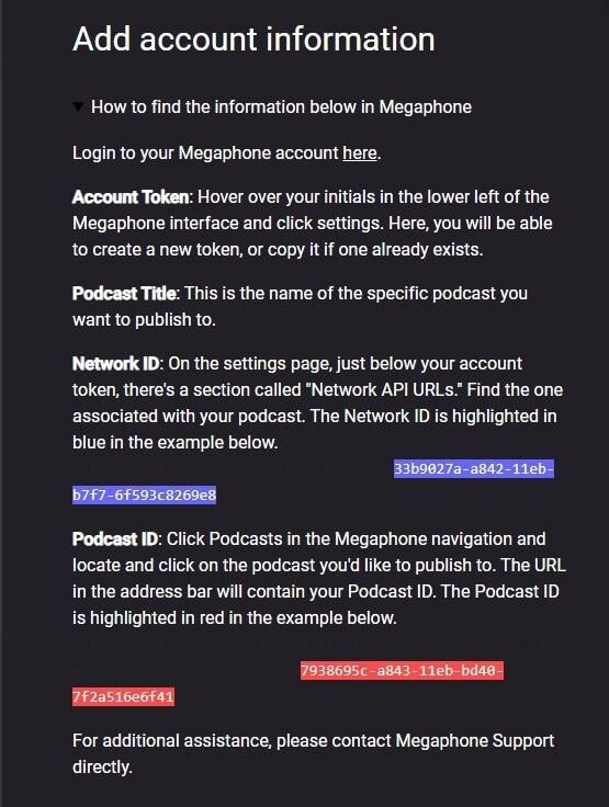 4. Use these instructions to gather the necessary information from your Megaphone account.