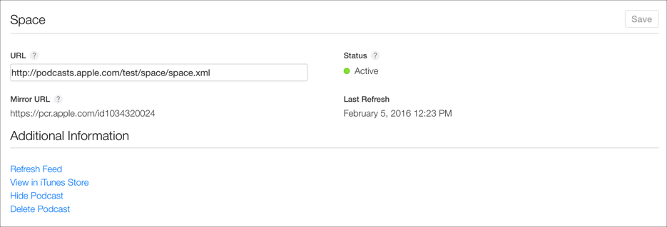 - Upon saving, Apple Podcasts Connect will update your RSS feed URL and display your podcast in the dashboard along with the Scheduled for Update status.