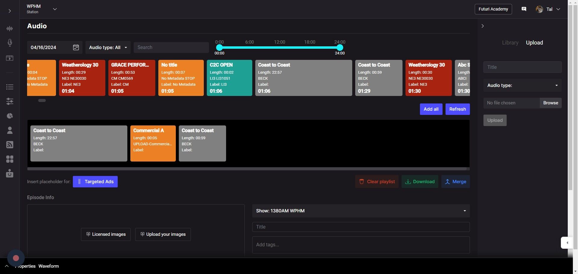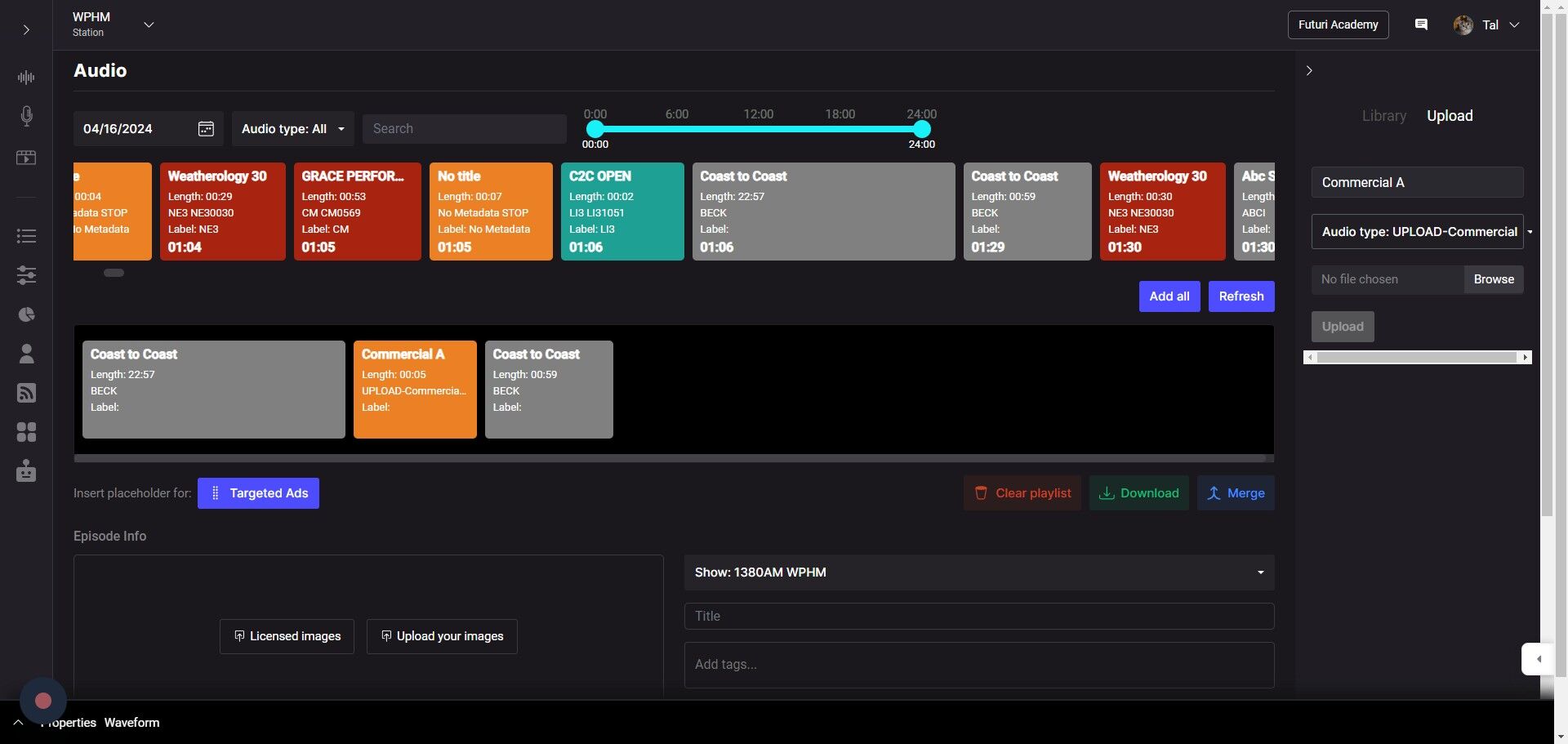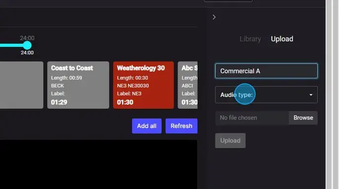 2. Open the Audio Library and click on the Upload section if you need to add a new file containing your ad audio.