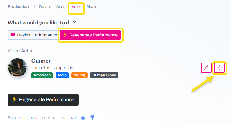 After you generate your spot, navigate to the Voice tab and click the gear icon under Regenerate Performance.