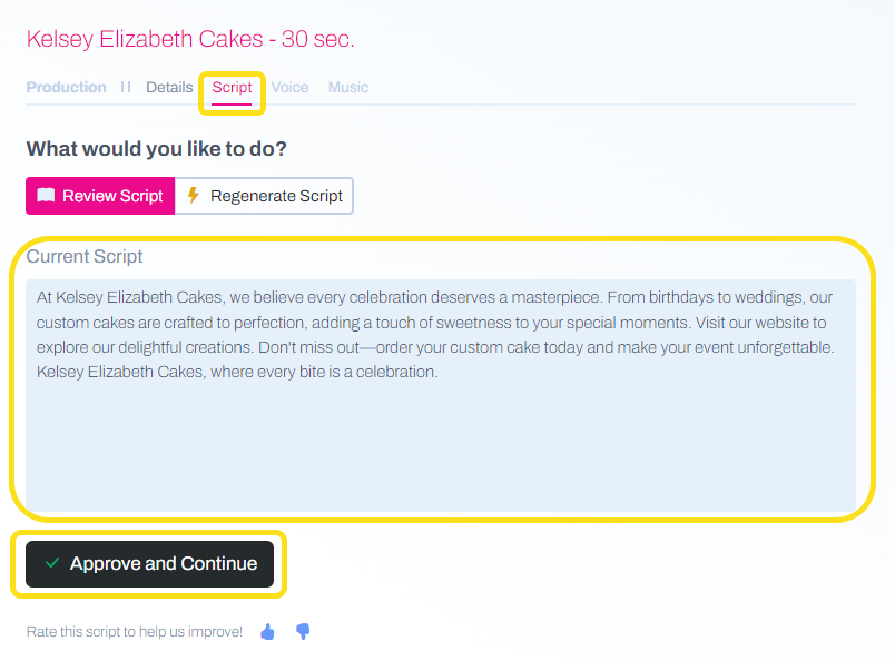 Open your draft Spot and navigate to the Script tab. Click into the Current Script box and edit the copy/script using the best practices for AI copywriting. Click Approve and Continue to lock in your changes. Your Spot will regenerate so you can listen to the updated version.