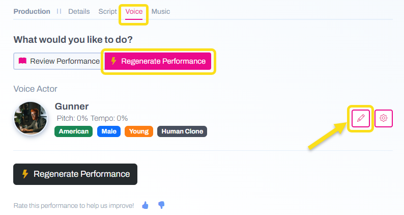 After reviewing your draft Spot, navigate to the Voice tab and click the pencil icon under Regenerate Performance.