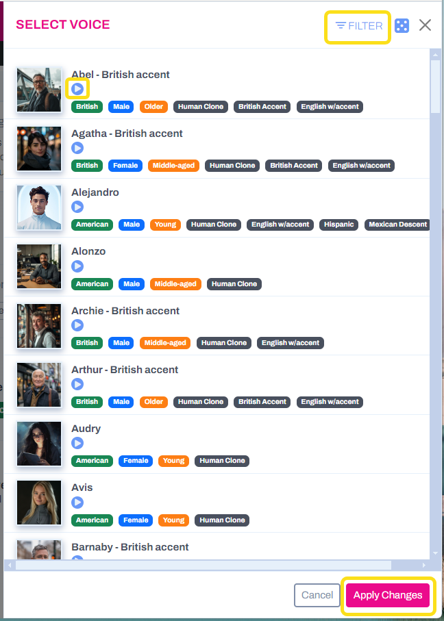 Then, you can scroll through the other voices in SpotOn's library. Click the play button by any voice to hear a preview. Use the filter options at the top to narrow the selections.
