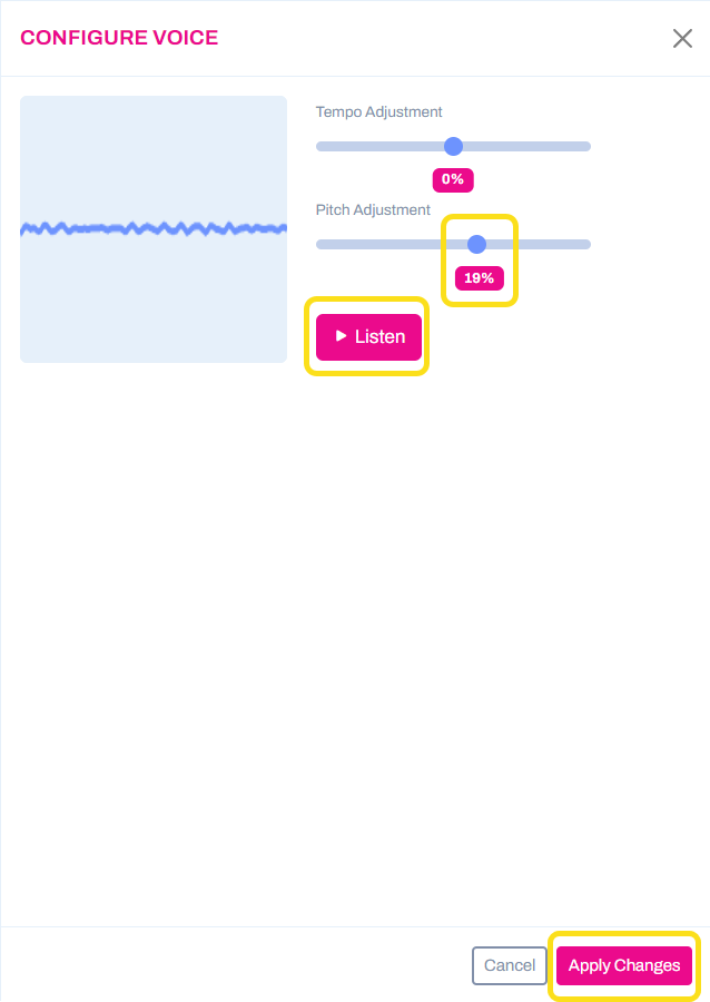 Click the Listen button. Then, adjust the pitch to your taste (try 79%) and you will hear the changes as you move the slider. You may also slightly increase the tempo of the voice (but remember, a little goes a long way). When satisfied, click Apply Changes.