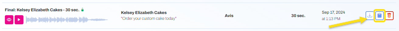 Locate the desired Spot in your Spot Library. Click on the clipboard icon to clone of the Spot. A draft copy of your original Spot will be created, allowing you to make additional edits without losing the original audio file.