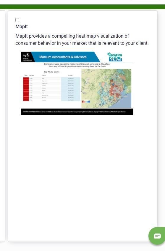 4. MapIt is TopLine’s heat map of consumer spending designed to identify areas of opportunity in a category of business within a specific market. It’s updated annually and comes from both the U.S. Census and the Bureau of Labor Statistics Consumer Expenditure Survey data.