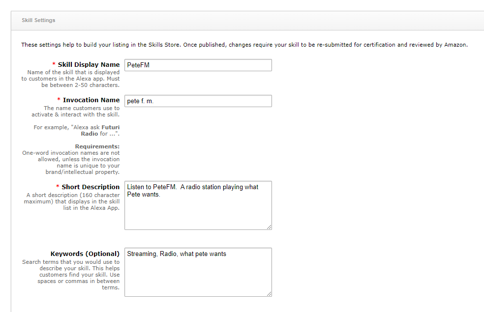 - Some updates, such as changes to the Skill Display Name, Invocation Name, Short Description or images, will require a rebuild and resubmission of the skill to Amazon. Once your updates are received, Futuri VIP Support will determine if a rebuild is needed and take care of that process, which can take up to a week for Amazon to approve.